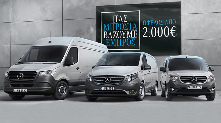 Η προσφορά περιλαμβάνει Φ.Π.Α. & Ειδικό Τέλος Ταξινόμησης -και ισχύει για τα μοντέλα Citan Van PRO, Vito Van PRO & Sprinter Van PRO.