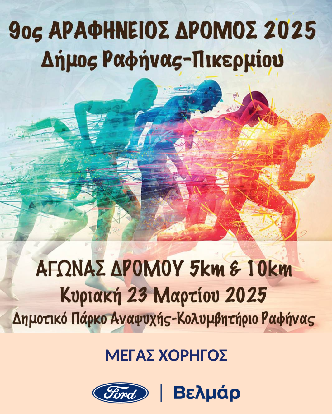 Την Κυριακή 23 Μαρτίου, στην πόλη της Ραφήνας διοργανώνεται ο «ΑΡΑΦΗΝΕΙΟΣ ΔΡΟΜΟΣ 2025» υπό την αιγίδα του Δήμου Ραφήνας-Πικερμίου, μέσω του Δημοτικού Αθλητικού Συλλόγου ΑΡΑΦΗΝ, με την υποστήριξη της Ford Βελμάρ. Πρόκειται για μία μεγάλη τοπική αθλητική διοργάνωση που περιλαμβάνει αγώνα δρόμου 5.000μ., 10.000μ. και 1.000 παιδικό.