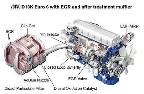 Ο κινητήρας D13 Euro 6 της Volvo βασίζεται στο δοκιμασμένο κινητήρα της εταιρείας με προδιαγραφές Euro 5. Όπως ακριβώς αυτός, έτσι και ο νέος κινητήρας είναι 6κύλινδρος εν σειρά με αυτόνομα μπεκ ψεκασμού και επιλεκτική κατάλυση (εν συντομία SCR). Για να καλυφθούν οι νέες αντιρρυπαντικές προδιαγραφές, χρησιμοποιείται επίσης και το σύστημα επανακυκλοφορίας των καυσαερίων (το γνωστό EGR), καθώς και φίλτρο παρακράτησης αιωρούμενων σωματιδίων πετρελαίου (το DPF), συστήματα τα οποία η Volvo Trucks ήδη χρησιμοποιεί εδώ και αρκετά χρόνια σε Αμερική και Ιαπωνία. Σε σύγκριση με τους Euro 5, οι εκπομπές οξειδίου του αζώτου από τους κινητήρες Euro 6 έχουν μειωθεί –όπως ειπώθηκε παραπάνω– κατά 77%, ενώ εκείνες των σωματιδίων έχουν πέσει στο μισό.